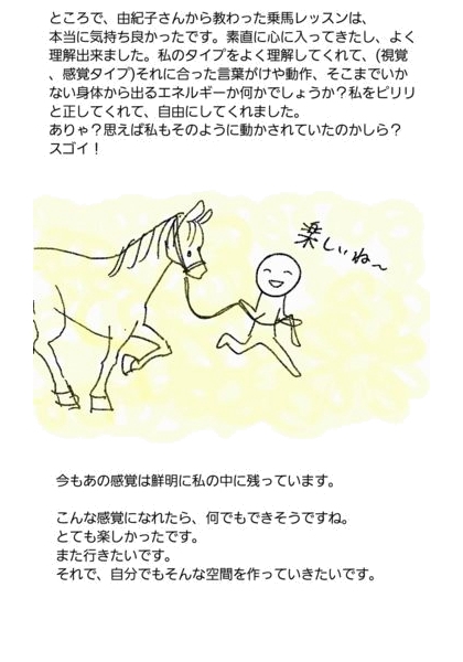 初めて馬に乗った時に啓示を得たように、言葉だけでは人に伝えることができない「非言語コミュニーション」を馬から教わり、また、馬で人に教えることができると確信。馬2頭を飼い始めるところからスタートし、さまざまな分野の馬のプロ22人に教わりながら練習と研究を始める。